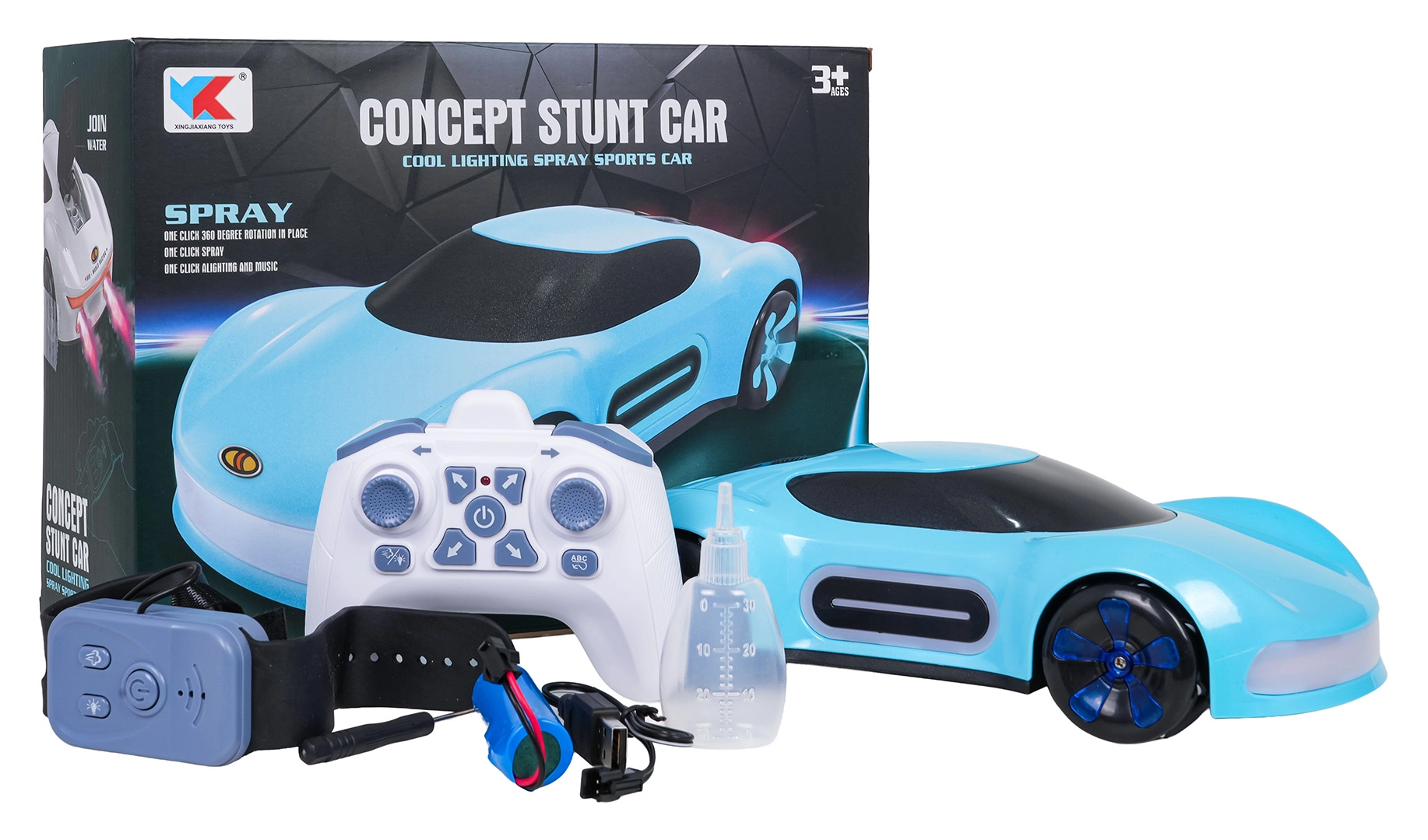 Az autó képes előre/hátra menni, jobbra/balra fordulni, oldalazni, driftelni és 360°-ban fordulni. Az irányítás intuitív – válassz a kézi távirányító és az órás, gesztusvezérelt irányítás között. A csomag tartalmaz egy tölthető 3,7 V-os akkumulátort és egy USB kábelt az egyszerű töltéshez.