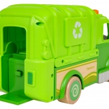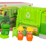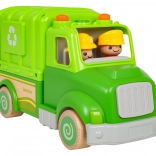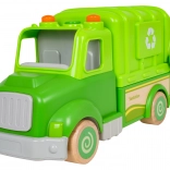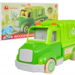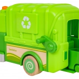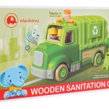 Ez a zöld kukásautó biztonságos és kreatív játékra készült. Lekerekített formák, fa kerekek és masszív fa-műanyag felépítés teszik ideális játékká a gyerekek számára. A tetőn egy gomb található, amely dallamokat, menet-, indítási- és dudahangokat indít, villogó fényekkel kiegészítve.