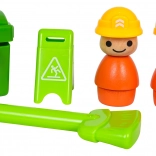 A csomagban 2 figura, szemetes kuka, figyelmeztető tábla és seprű található. Minden biztonságos kialakításban, élénk színekkel.