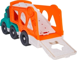 Színes, bioplasztikból készült autómentő, amely egy játékban ötvözi az autószállítót és a formabedobót. Tartalmaz 2 kisautót és 4 formát, gördülékeny kerekekkel, strapabíró kialakítással és levehető pótkocsival. 18 hónapos kortól ajánlott, biztonságos és környezetbarát – ideális beltérre és kültérre egyaránt.