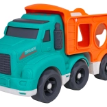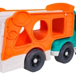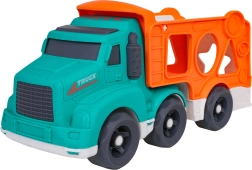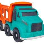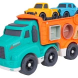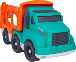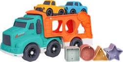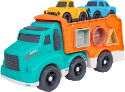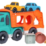A készlet simán gurul a padlón, könnyen leválasztható pótkocsival rendelkezik, és szállíthatók rajta a kisautók és a formák is. Tökéletes az önálló játékhoz és a közös felfedezéshez kint és bent.