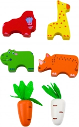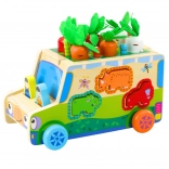 - fa autó levehető tetővel, 6 db répa (kb. 8 cm), 8 db mágneses bogár (kb. 5,5 cm), 2 db mágneses figura (kb. 6,5 cm), 6 db állat a formaválogatóhoz