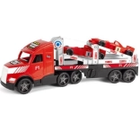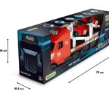 A nagy Magic Truck Action Formula 1 szállító minden kis autó- és versenyrajongónak örömet szerez. A valósághűen kidolgozott vontató a hosszú félpótkocsival két mellékelt F1-es versenyautót szállít, amelyeket a rámpák segítségével könnyedén fel lehet hajtani. A pótkocsi leválasztható, és kétféleképpen csatlakoztatható a fülkéhez, ami bővíti a játék lehetőségeit.
