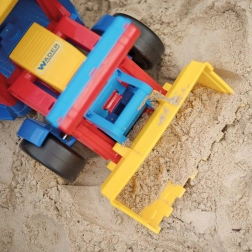 Nagy műanyag traktor működő első kanállal homok felvételezésére, átszórására és tolására. Tartós kialakítás biztonságos műanyagból, ideális kertbe, játszótérre és otthonra. Hossza 60 cm, a könnyen kezelhető kanál fejleszti a motorikát és a kreatív játékot.