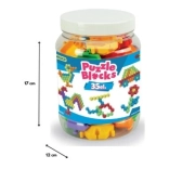 Színes, gyermekeknek szánt puzzle típusú építőkészlet 35 darabbal praktikus, visszazárható üvegben, amely fejleszti a kreativitást, a finommotorikát és a logikus gondolkodást. Az elemek könnyen összekapcsolhatók, és lehetővé teszik állatok, járművek, betűk, számok, valamint térbeli és síkbeli formák építését biztonságos, tartós anyagból.