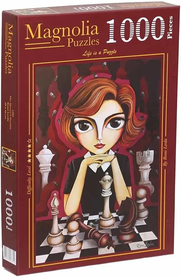 Stílusos puzzle The Queen's Gambit motívummal a MAGNOLIA márkától, amely szórakozást és kikapcsolódást kínál. 1000 darabot tartalmaz, és kirakva kb. 48 × 68 cm méretű – ideális keretezéshez, valamint ajándéknak a sakk és a design illusztrációk kedvelőinek.
