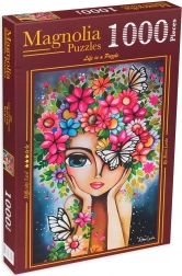 Elegáns puzzle egy virágokkal körülvett lány motívumával a nyugodt, pihentető pillanatokhoz. 1000 darabot tartalmaz, és kirakva a mérete 48 × 68 cm – ideális keretezéshez és kiállításhoz.