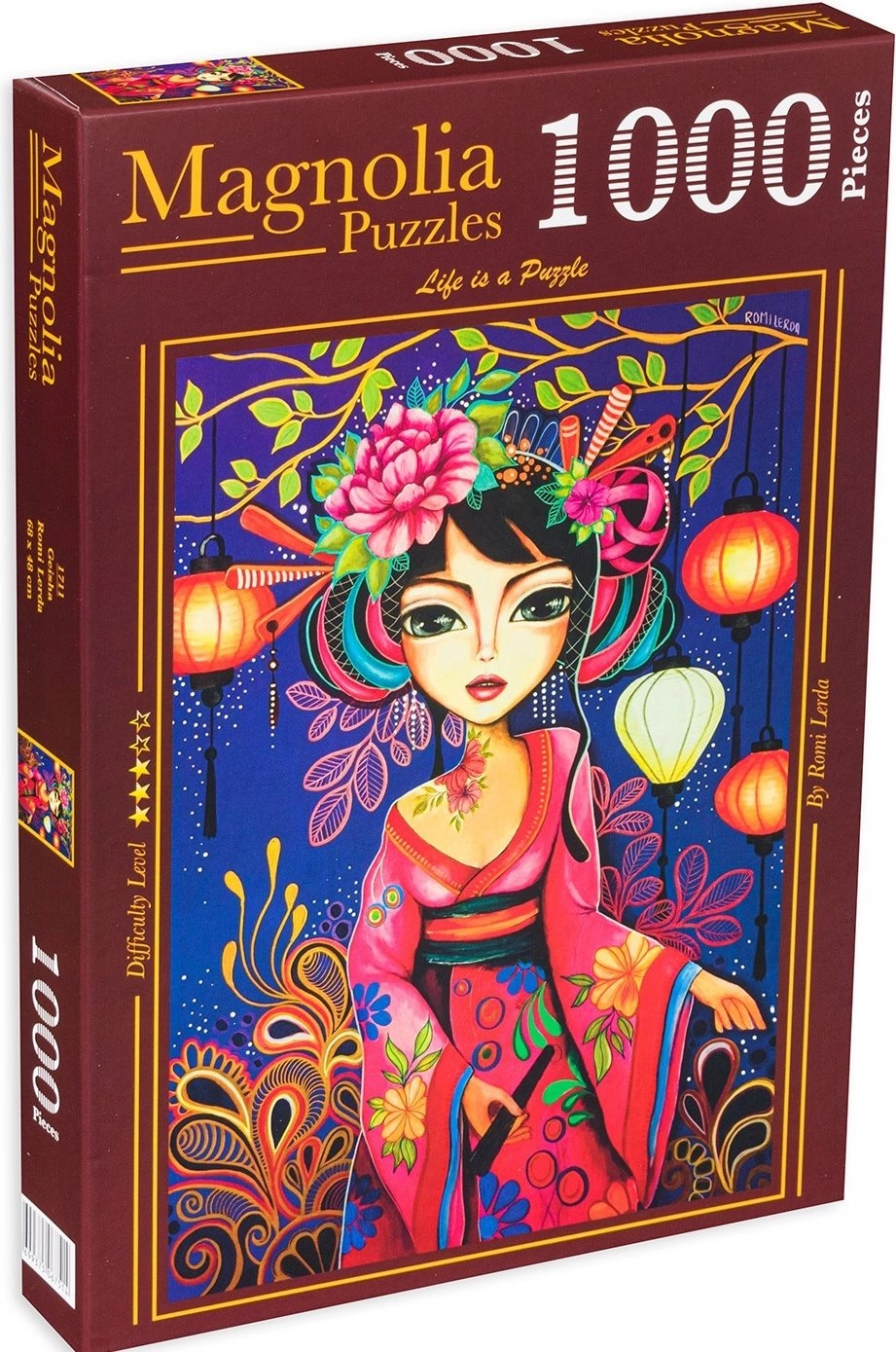 Élvezze a pihentető kirakózást elegáns gésa motívummal. Ez a minőségi, 1000 darabos puzzle részletgazdag illusztrációt kínál, és kirakva kb. 48 × 68 cm méretű – ideális keretezéshez és lakásdekorációhoz.