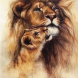 - Realista motívum az oroszlánról és kölykéről, látványos végeredménnyel