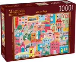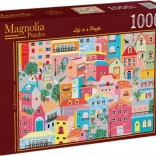Stílusos puzzle feltűnő, színes házas motívummal, kiegyensúlyozott nehézséggel és látványos vizuális hatással az összeállítás után. Az 1000 darab hosszú órákon át tartó, fókuszált szórakozást biztosít, a kész kép pedig szép dekorációként szolgálhat.