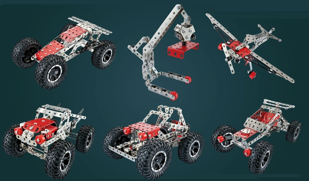 Építsd meg saját terepjáró modelledet egy masszív, 288 darabos készletből. A fém elemek és műanyag kiegészítők csavarokkal és anyákkal kapcsolódnak, így az építés stabil, szórakoztató, és egyben kihívás az ügyes kezeknek és a türelemnek. Ideális a finommotorika, a logikus gondolkodás és a kreativitás fejlesztésére.