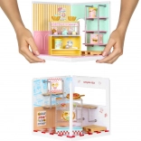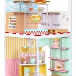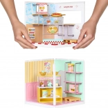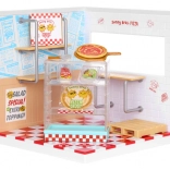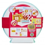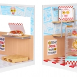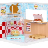 Rendezd be a vitrint, pizzásdobozokat és a munkapultot, díszítsd a falakat, és készíts mini pizzát tálalásra. Ideális kiszolgálós szerepjátékhoz és a gyűjtemény kiállításához.
