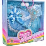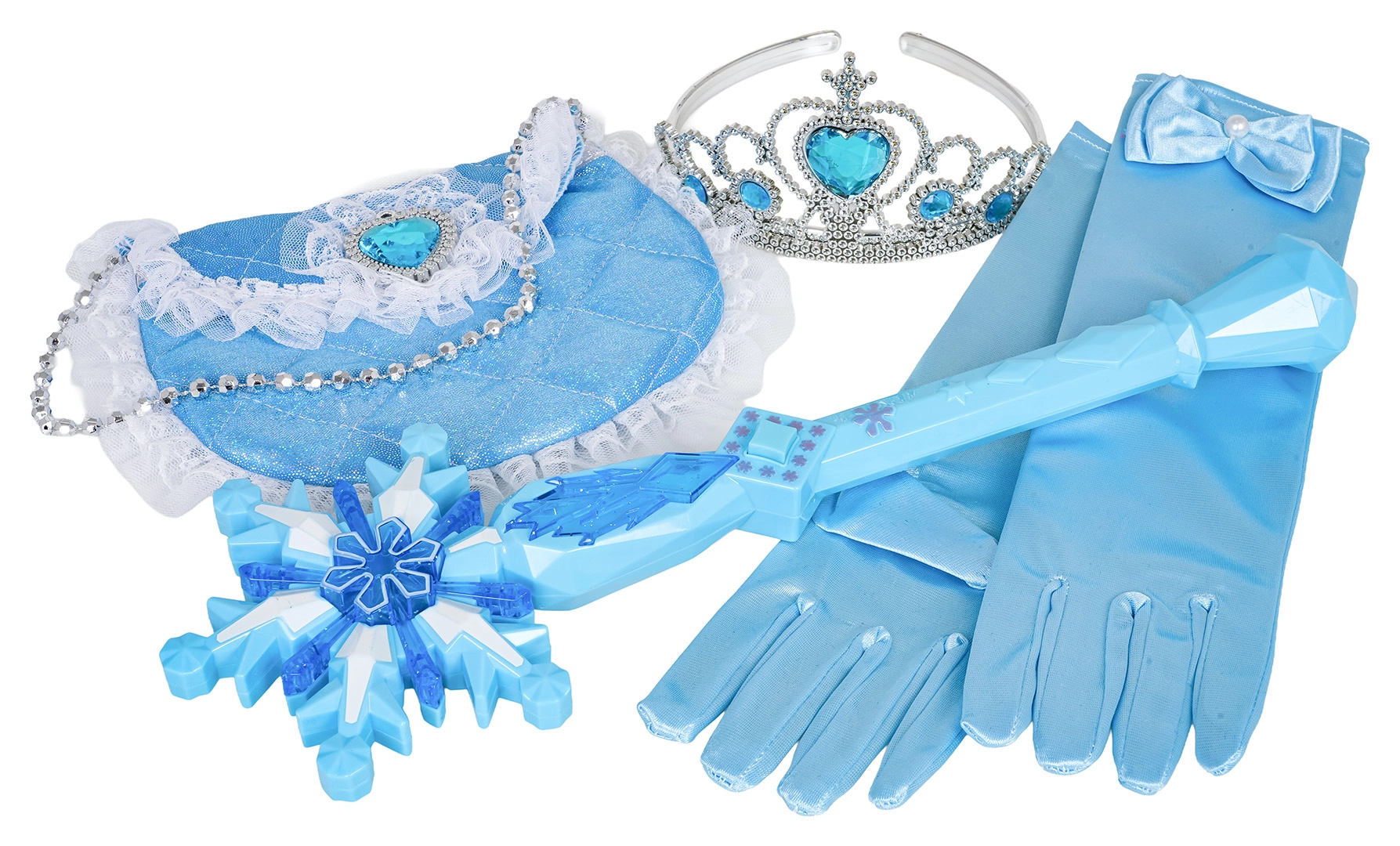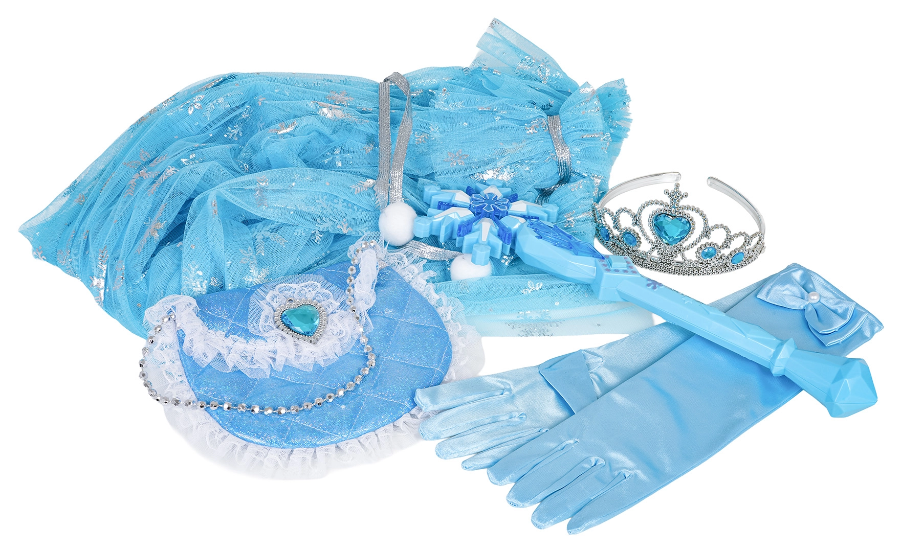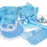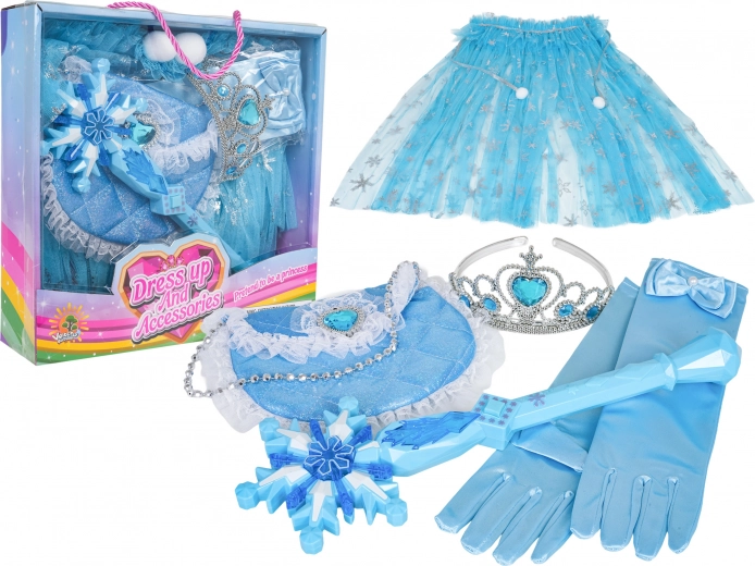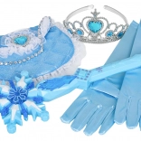 Összeillő ruha/szoknya, kesztyűk, tiara, pálca és táska egységes jégkék árnyalatban a tökéletes mesés megjelenésért.