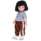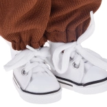 A sportos öltözék a kényelmet és a modern megjelenést ötvözi: szürke mintás póló, barna melegítőnadrág fehér csíkokkal és fehér fűzős tornacipő. A mozgatható fejnek, karoknak és lábaknak köszönhetően könnyedén alkothatsz új jeleneteket és történeteket.