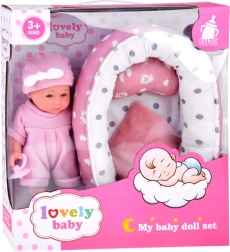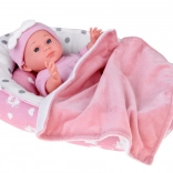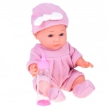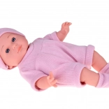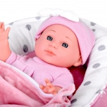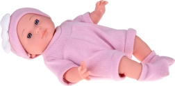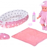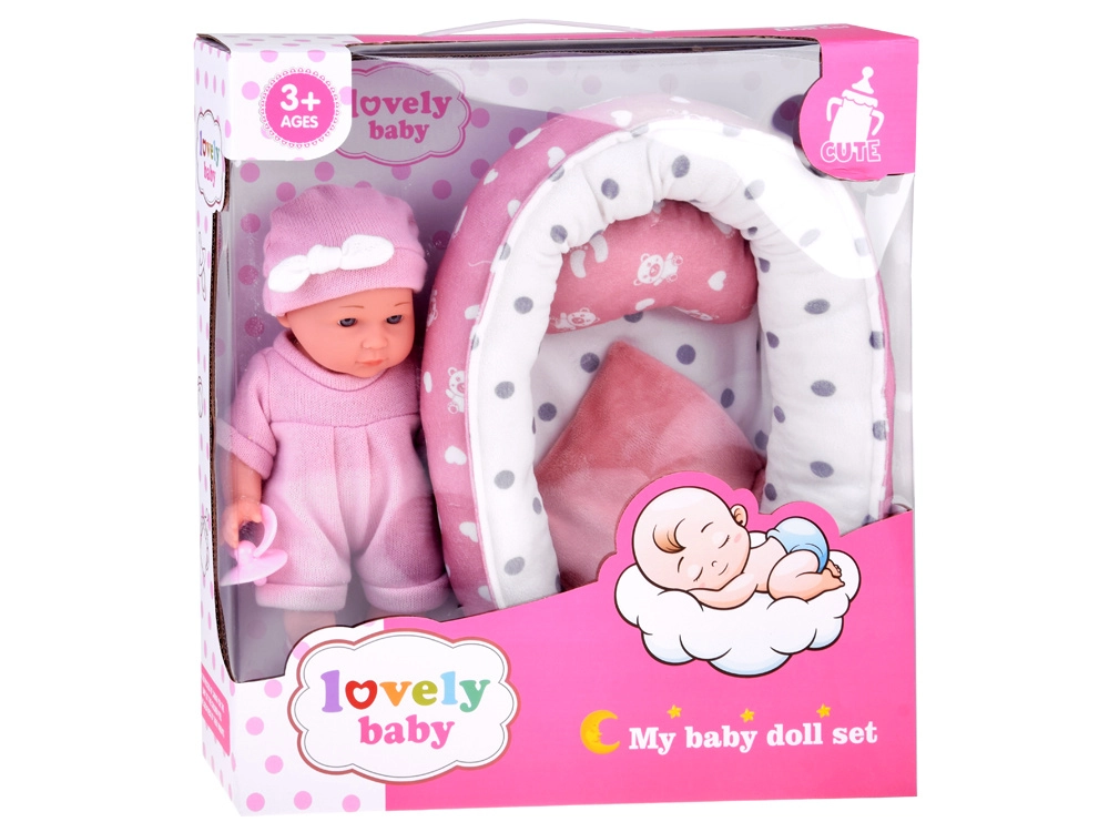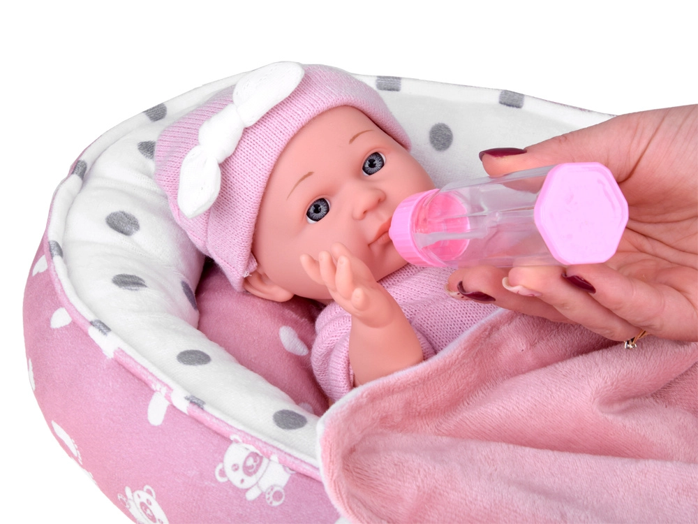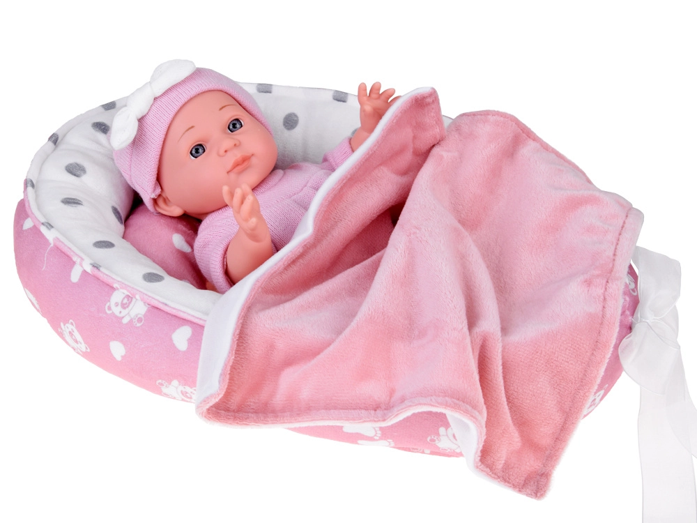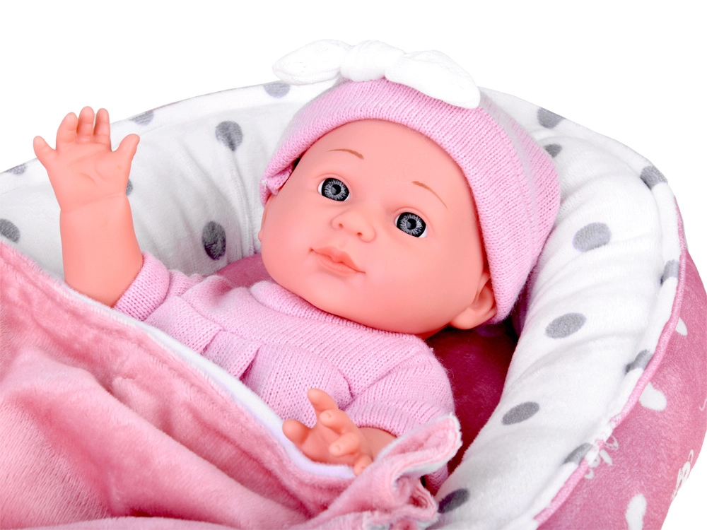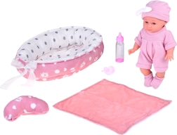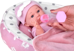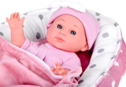 Cuki babácska rózsaszín ruhácskában, puha fészekkel, párnával és takaróval, amely valósághű gondoskodó játékot nyújt. A csomag része egy cumisüveg és egy cumi is, a baba mozgatható végtagokkal és könnyen levehető ruhácskákkal rendelkezik finom pasztellszínekben.