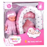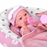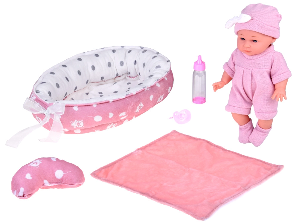 - Baba rózsaszín ruhácskában és sapkában, textil fészek párnával és takaróval, cumisüveg, cumi