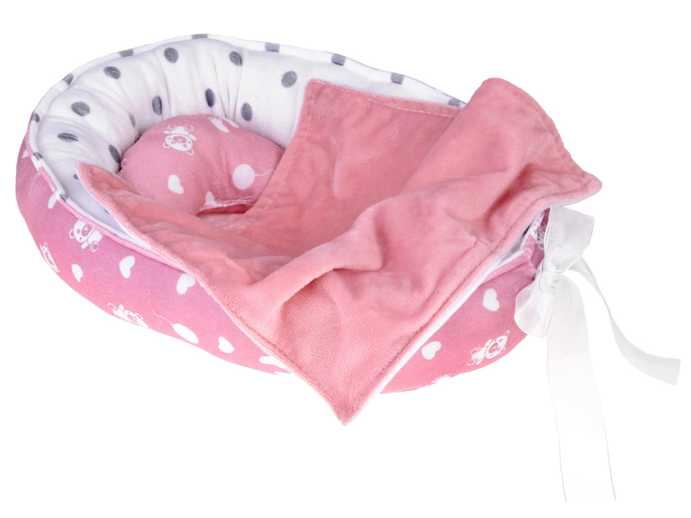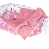 Textil bölcső pöttyös béléssel és masnival, amely meghitt hátteret biztosít a babának. A gyerekek könnyedén áthelyezhetik, és bárhol, bármikor altathatják a babát.