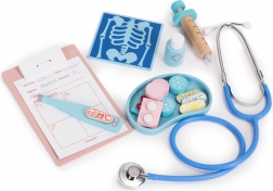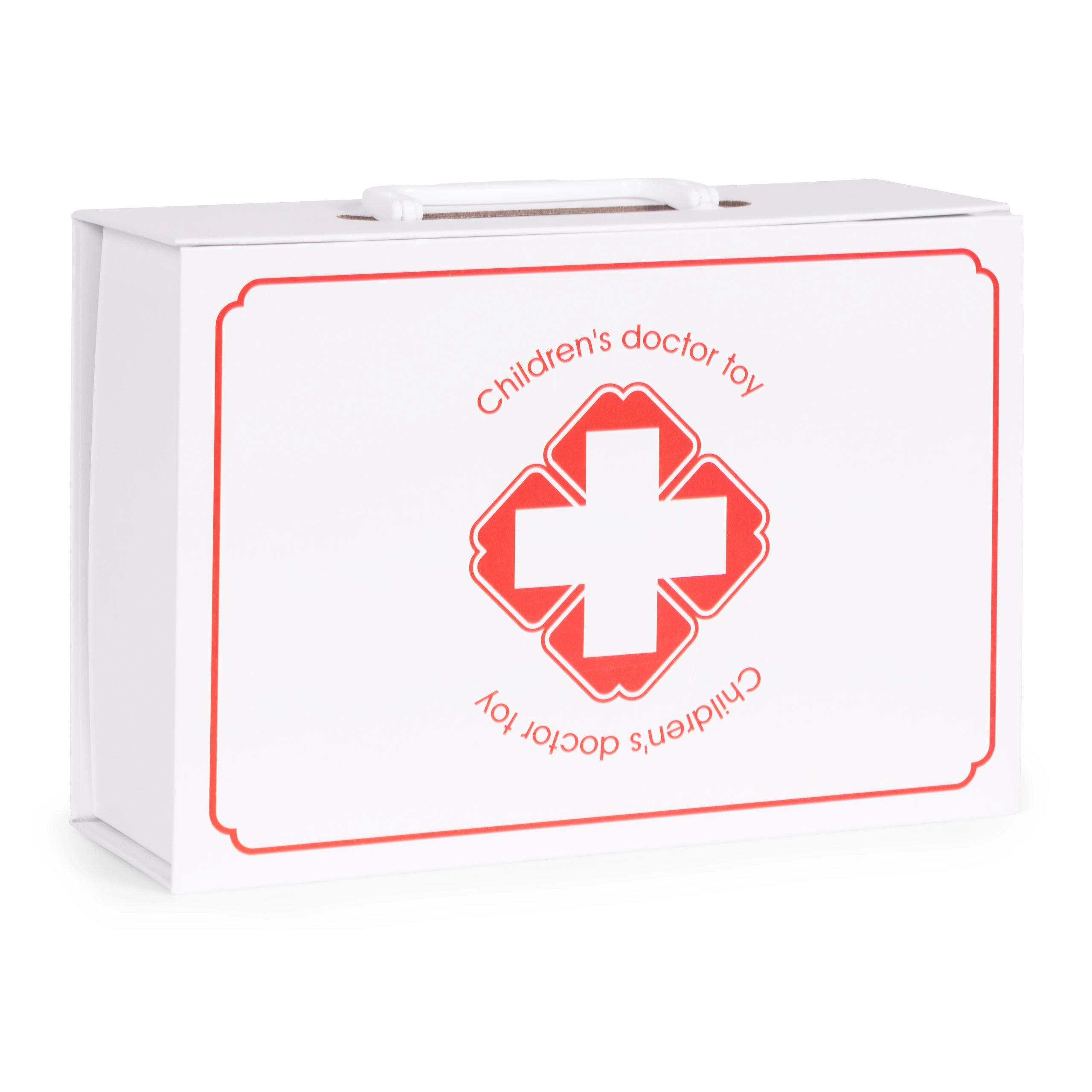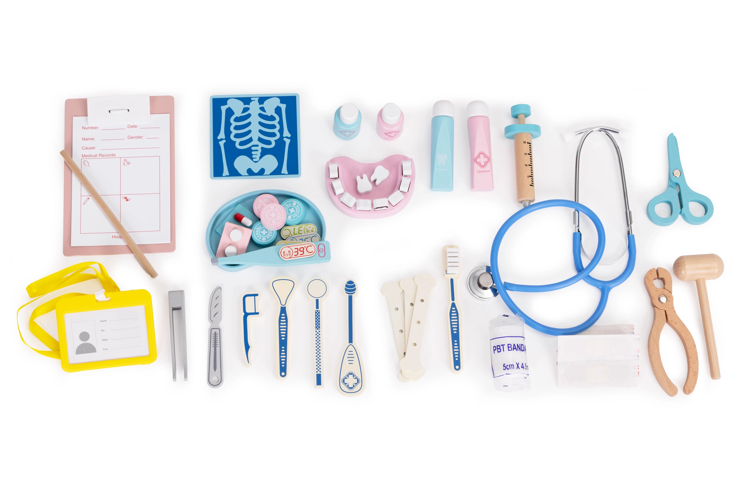 A gyerek orvosi bőrönd mindent tartalmaz a kis orvosoknak és fogorvosoknak: sztetoszkóp, hőmérő, injekciós fecskendő, kötés, valamint fogtükör, műállkapocs kivehető fogakkal és további kiegészítők. A készlet ideális otthoni és óvodai játékhoz, és segít csökkenteni az orvosi vagy fogorvosi látogatástól való félelmet.