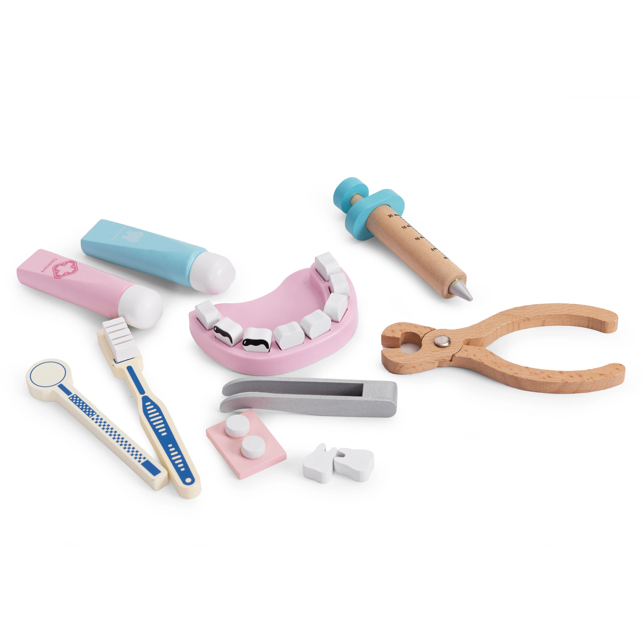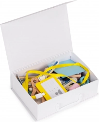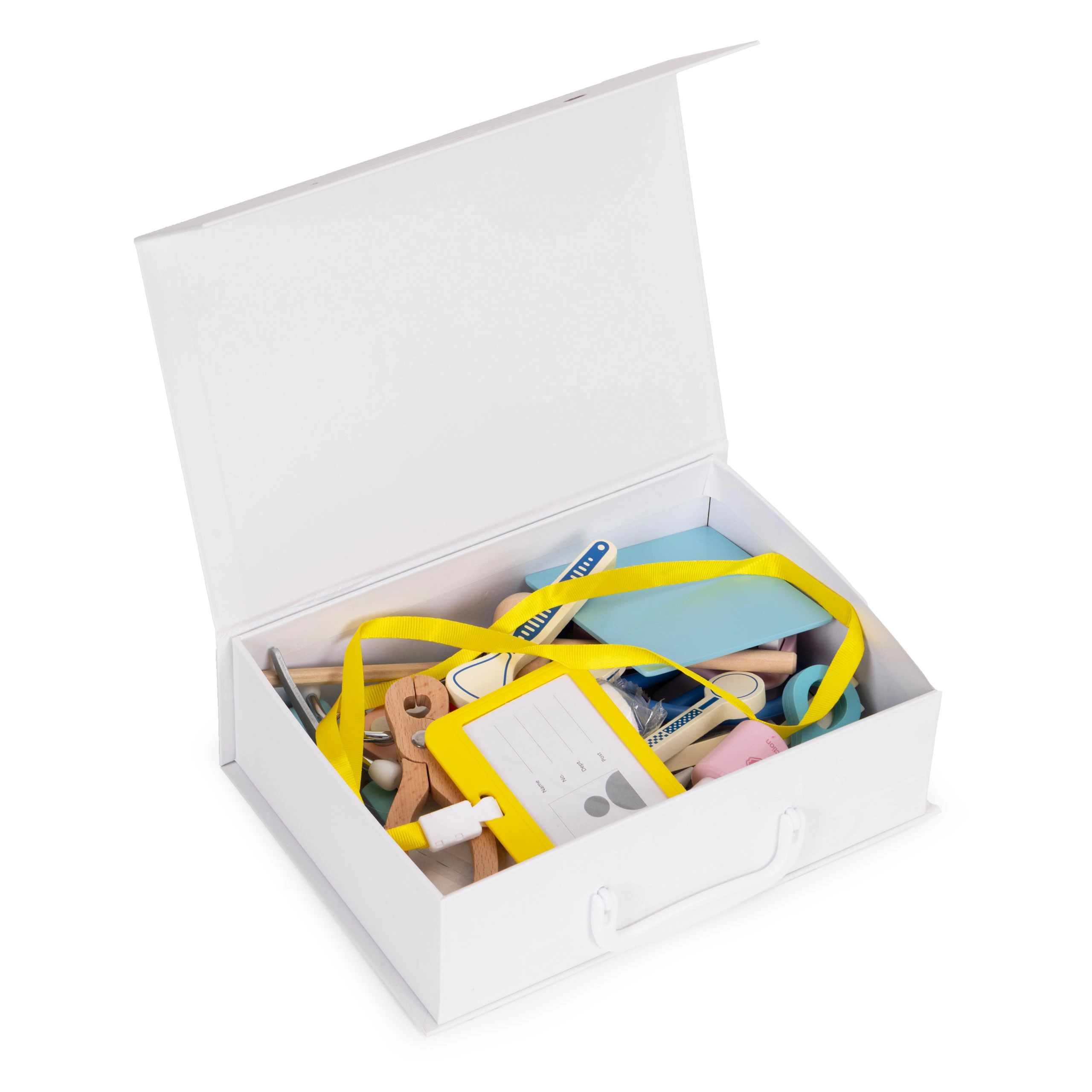 Minden alkatrész tartós fából, kellemes pasztellszínekben készült, és masszív bőröndben kapott helyet a könnyű hordozás és rend érdekében. A valósághű kivitelnek köszönhetően a gyerekek megtanulnak gondoskodni másokról, fejlődik a képzelőerejük és a kéz-szem koordinációjuk.