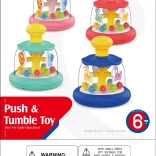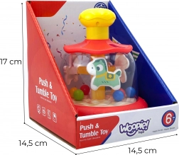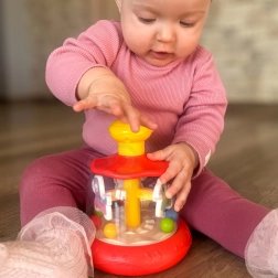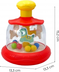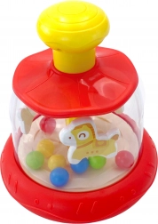 Ez a színes, lovacskával és golyókkal ellátott forgó játék minden babának örömet szerez. Elég megnyomni a sárga felső gombot, és a belső forgó rész mozgásba lendül – a golyók felgyorsulnak, látványos kavalkádot és finom csörgő hangot keltve. A játék szórakozást és érzékelésfejlesztést nyújt egyben.