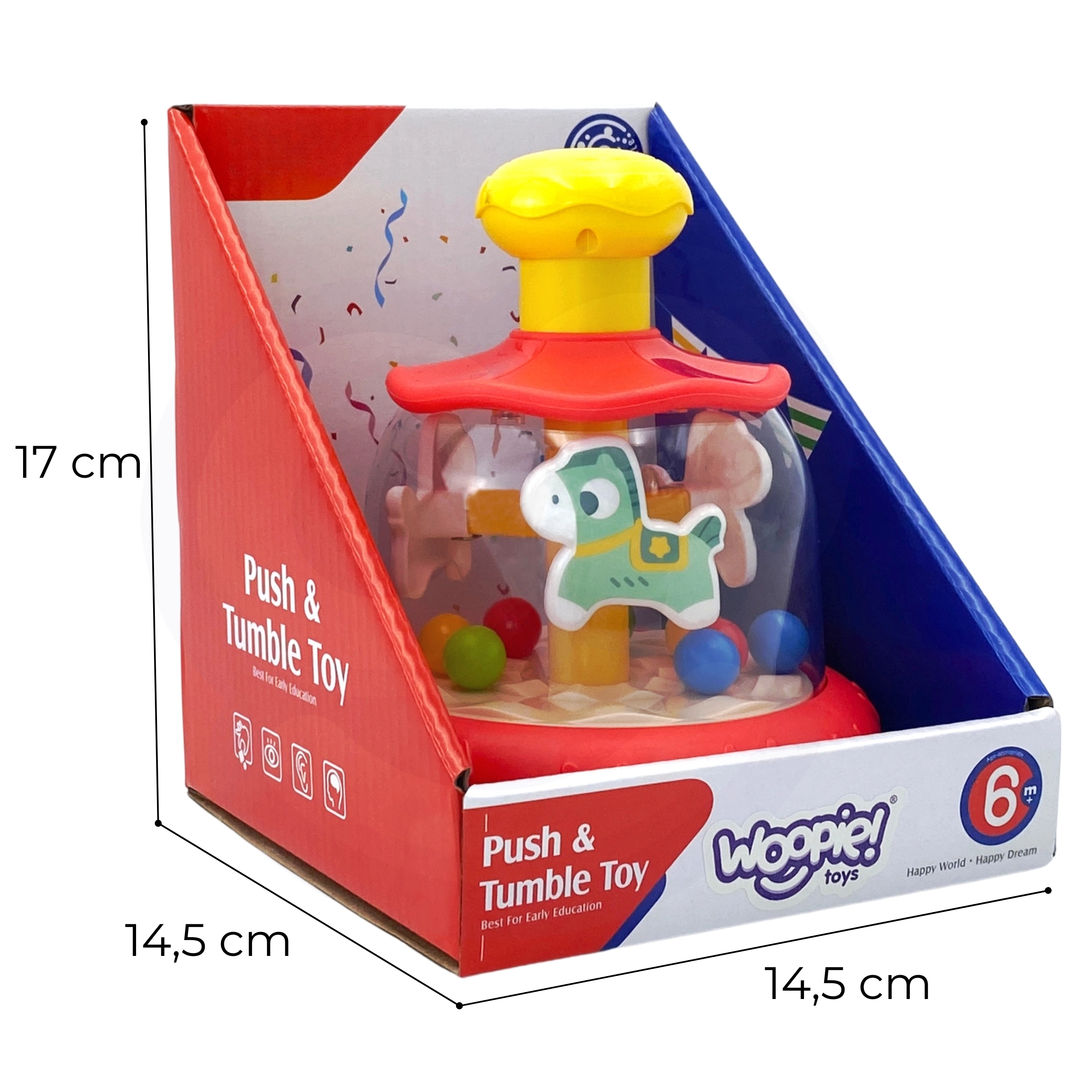 Fedezze fel a legkisebbeknek készült szórakoztató forgó játékot, amely a felső gomb megnyomására mozgásba hozza a lovacskát és a golyókat az átlátszó kupola alatt. A játék vizuális és hangingerlést kínál, támogatja a finommotorikát, a kéz–szem koordinációt és az ok–okozat megértését. A biztonságos kivitelnek és az élénk színeknek köszönhetően kb. 6 hónapos kortól ideális választás.