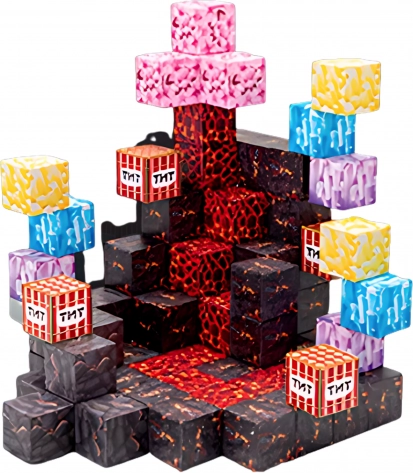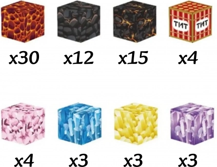 - 30× piros-fekete kocka; 12× szürke kocka; 16× fekete–narancssárga kocka; 4× TNT kocka; 4× rózsaszín kocka; 3× kék kocka; 3× lila kocka; 2× sárga kocka