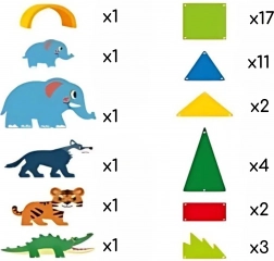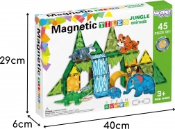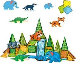 A különböző formájú és színű mágneses lapkák a beépített mágneseknek köszönhetően könnyen és erősen kapcsolódnak egymáshoz. A gyerekek változatos építményeket hozhatnak létre a természet elemeivel, mint például mozgó vízesés, boltívek, bokrok és fák, és életre kelthetik a jelenetet állatfigurákkal – elefánt, tigris, krokodil és farkas.