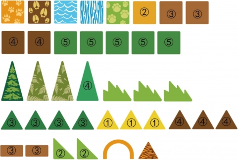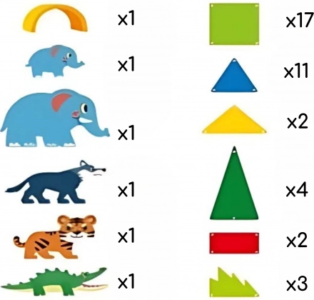 - mágneses lapkák (különböző formák és színek), állatfigurák (2× elefánt, tigris, krokodil, farkas), mozgó vízesés, boltív, bokrok és fák