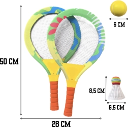 A csomag mindent tartalmaz az azonnali játékhoz: 2 nagy ütő, hab labda és színes tollaslabda puha csúccsal. A kényelmes hab markolatok csúszásmentesek és jól illeszkednek a gyerekek kezébe. A szett kiváló a kertbe, udvarra, strandra és beltérre is.