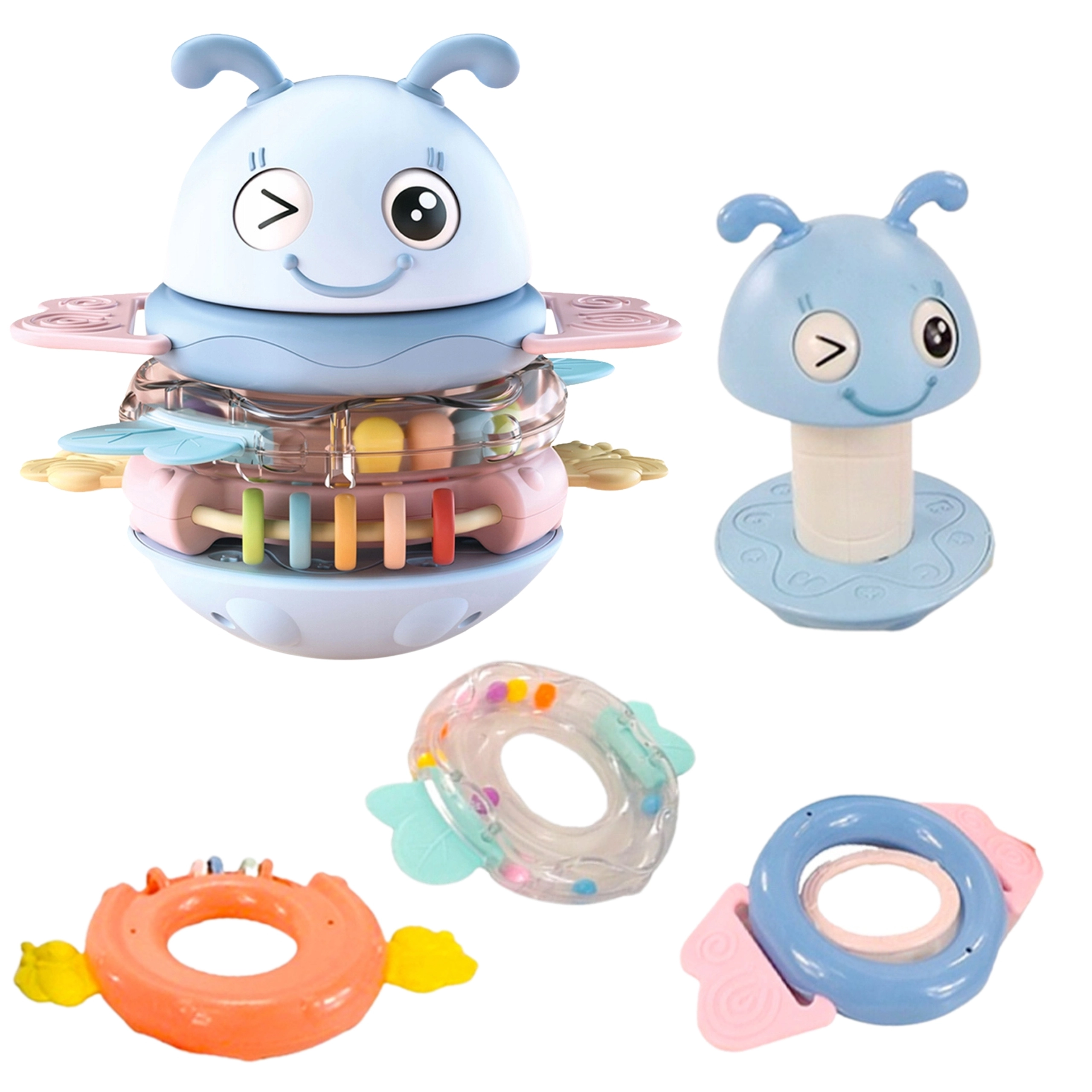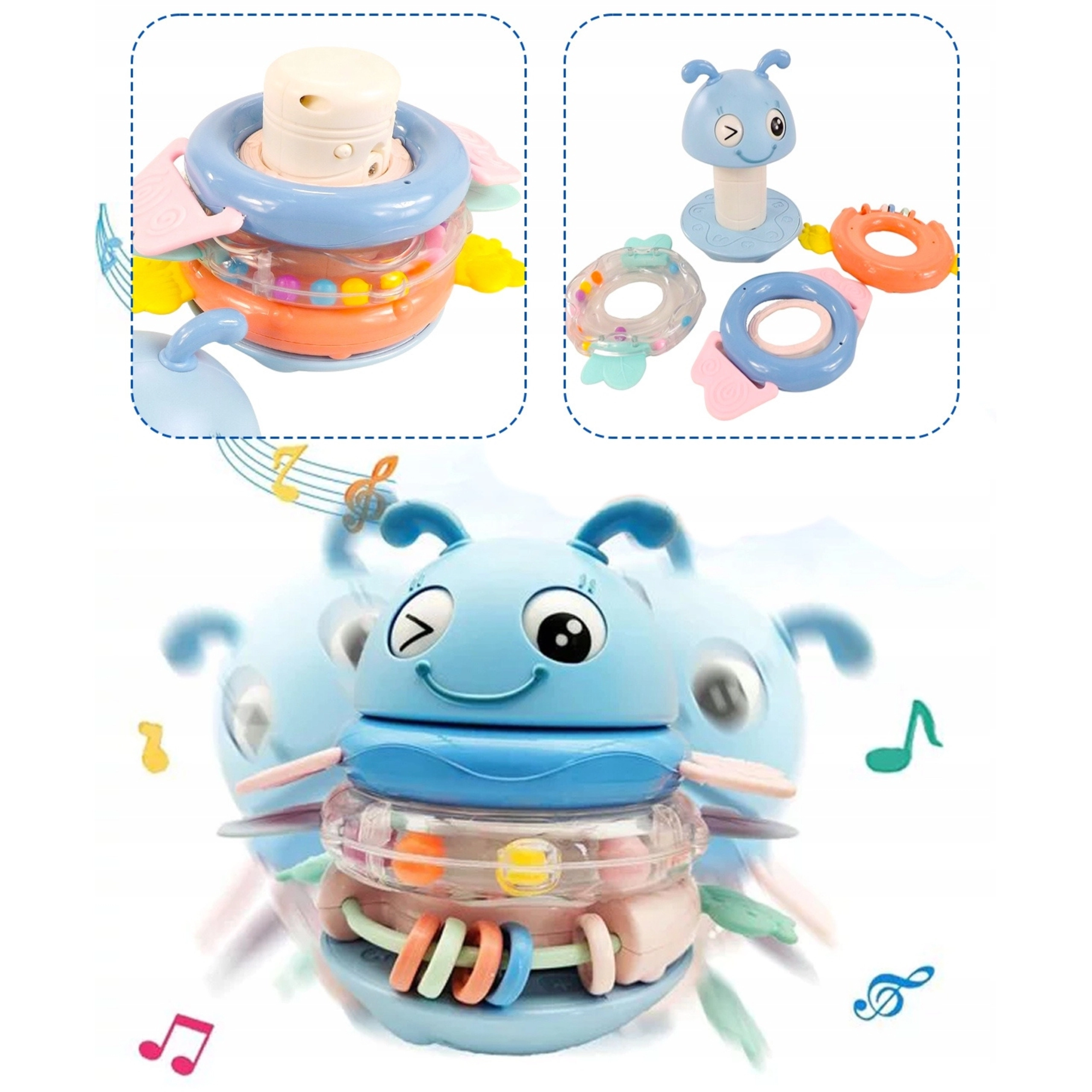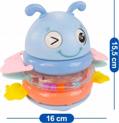 Ez a bájos „szitakötő” a színekkel, a mozgással és a hangokkal kelti fel a babák figyelmét. A karikák csörgőként és rágókaként is működnek, külön is használhatók, vagy felhelyezhetők a pálcára 2 hangmóddal (melódiák és mókás effektek). A puha szilikon kiemelkedéseknek köszönhetően gyengéden masszírozzák az ínyt fogzáskor.
