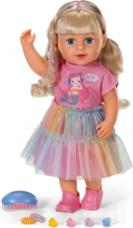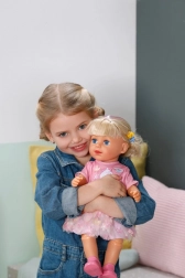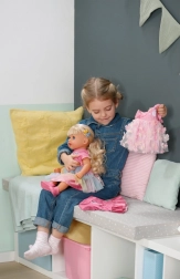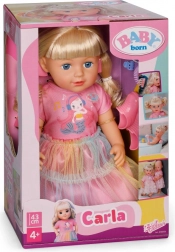 Fedezze fel a BABY born Carla babát 43 cm méretben, hosszú, minőségi hajjal és 7 fodrászati kiegészítőből álló szettel. Kiválóan mozgatható, önállóan megáll, stílusos öltözéke van, és masszív teste révén fürdethető is.