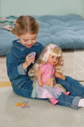 A BABY born Carla baba ideális társ a kreatív játékhoz és hajformázási kísérletekhez. A hosszú nejlon haj könnyen fésülhető és formázható, a mellékelt kefével, hajgumikal és csatokkal számtalan frizura készíthető. A valósághű megjelenés, a mozgatható végtagok és az önálló állás támogatják a fantáziát és a szerepjátékot.