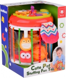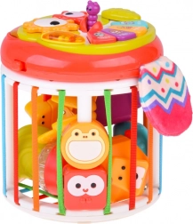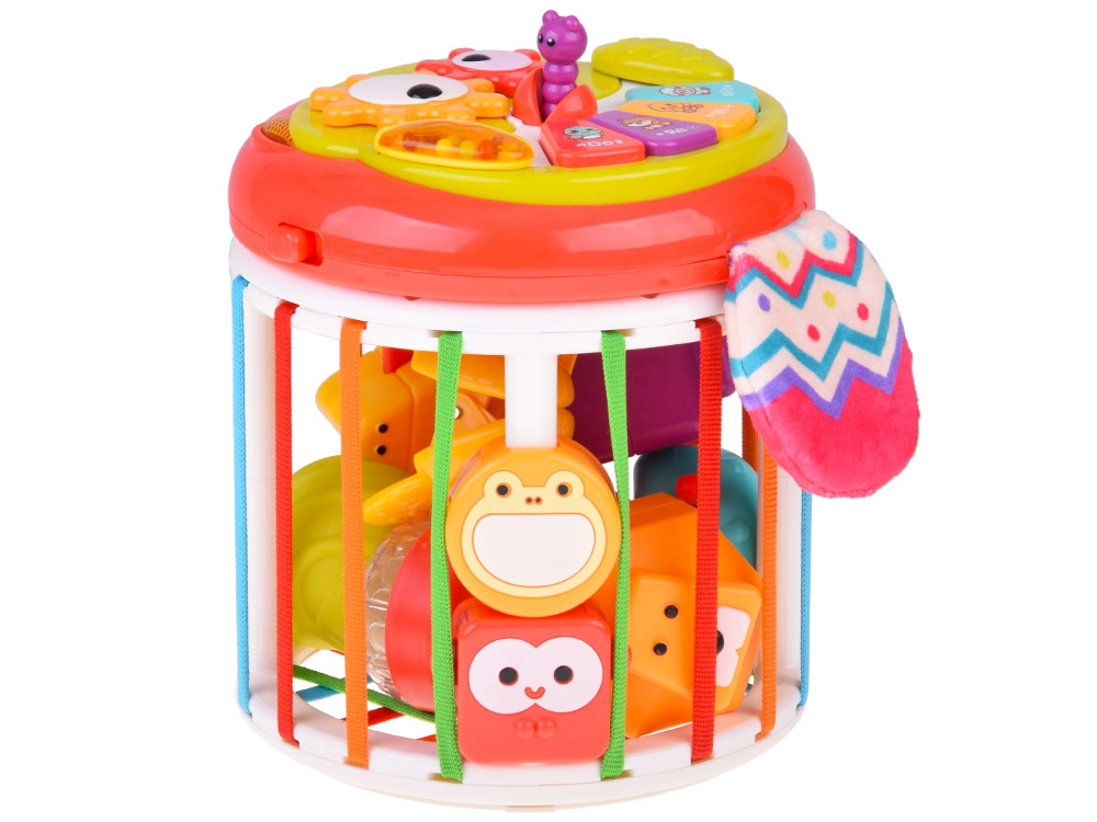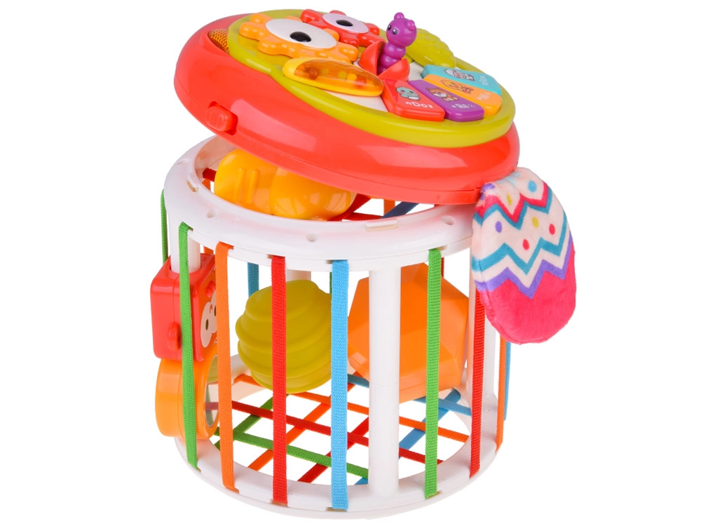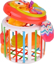 Az interaktív 2 az 1-ben bagoly két játékot kínál egyben: elektronikus részt állatgombokkal és hangokkal, valamint egy önálló színes formabedobót. Bekapcsoláskor üdvözlő dallam szólal meg, az egyes gombok pedig a hangneveket, állathangokat, rövid hangszeres dallamokat és vidám dalokat aktiválják. A gyerekek élvezhetik a forgó szemeket, a mozgó, gyöngyös szárnyakat, a puha zörgős farkincát és a gumis „kukac” húzókát.