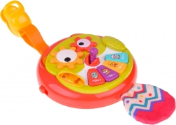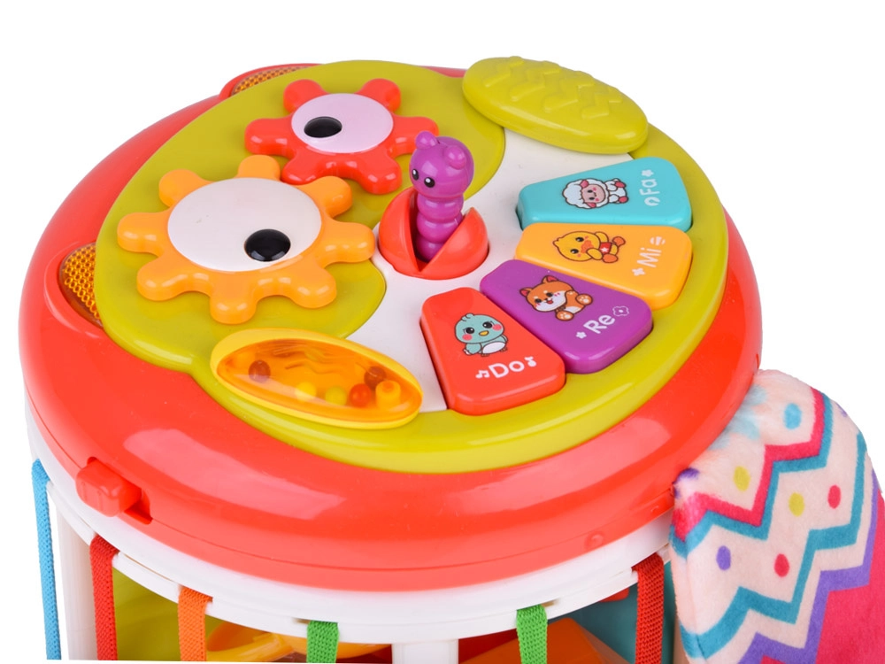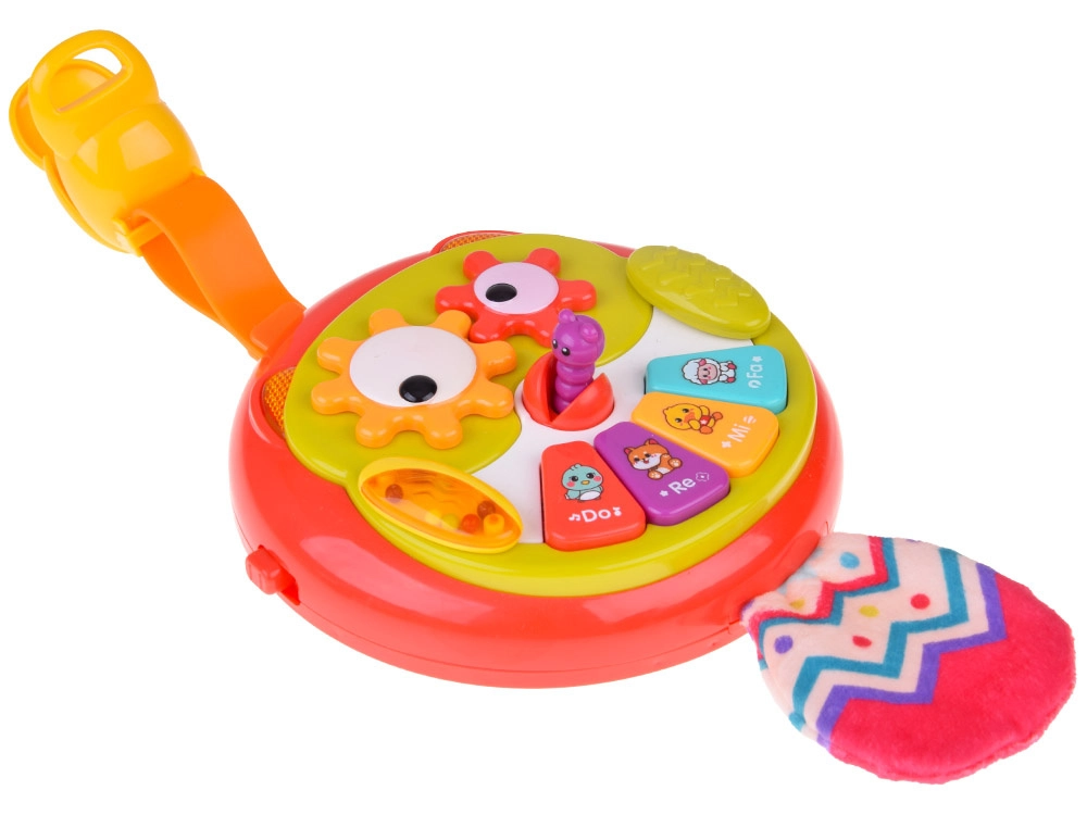 Forgó szemek, kattogó, gyöngyös szárnyacskák, húzható kukac és zörgős farok fejlesztik a tapintást, a hallást és a koordinációt. A levehető fej otthonra és utazáshoz is ideális.