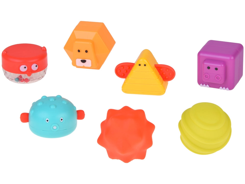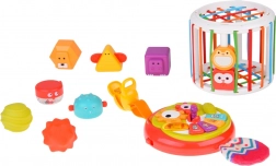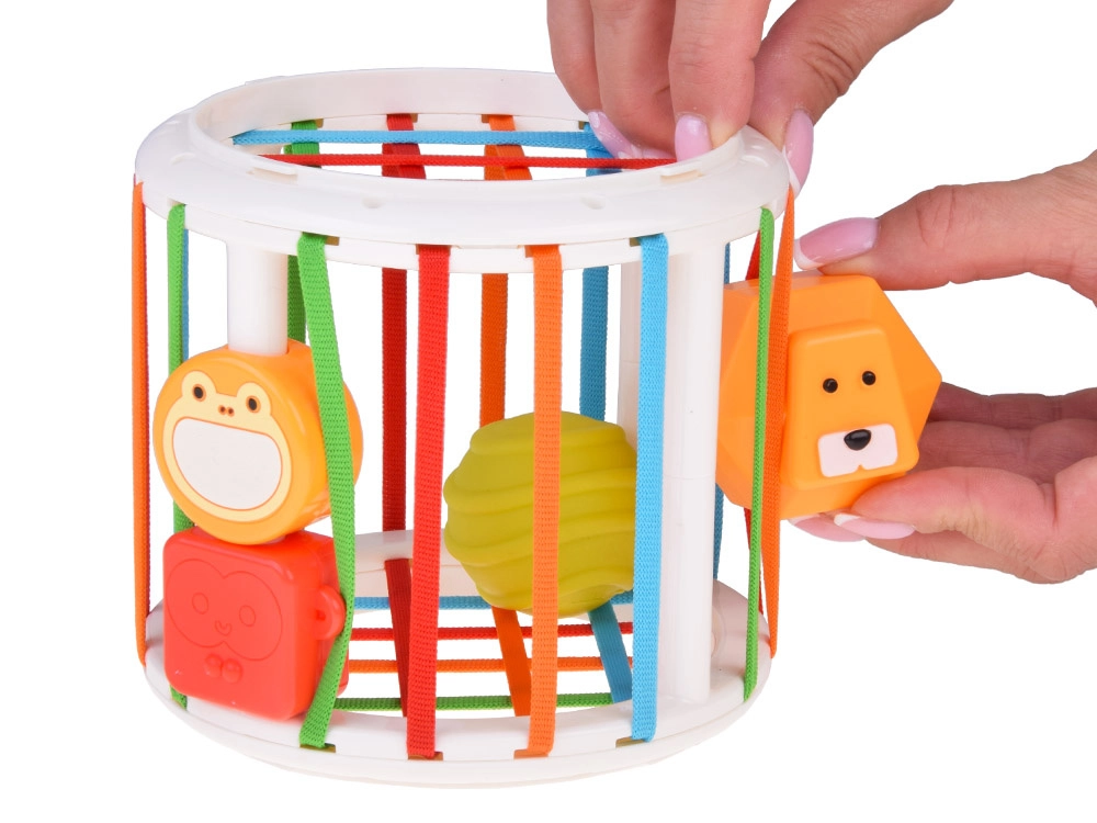 A formabedobót rugalmas, színes pántok alkotják, amelyek megkönnyítik az elemek betevését és kivételét, így természetes módon fejlesztik a fogást, az ujjak erejét és a pontosságot. Nem hiányzik a kis, biztonságos tükör az önarckép felfedezéséhez, valamint 7 különböző színű elem a bedobáláshoz. Az egész eszköz stimulálja a hallást, a látást és a tapintást, támogatja a koncentrációt és az önálló felfedezést.