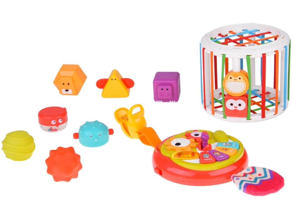 A színes gumipántok megkönnyítik az elemek betolását és kihúzását, miközben gyakoroltatják a fogást, a pontosságot és az ujjak erejét. A készlet része 7 különféle forma és egy kis tükör az érzékszervi felfedezéshez.