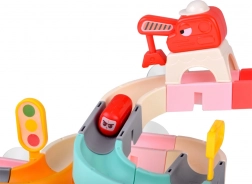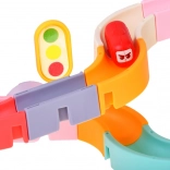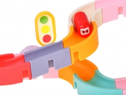 A csomag része egy mágneses daru horoggal, kísérő közlekedési táblák és „bab” formájú, kedves arcú kis autók. Az építés és a játék során a gyerekek gyakorolják a finommotorikát, a szem–kéz koordinációt, a térbeli képzelőerőt és az ok-okozati összefüggések megértését.