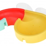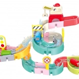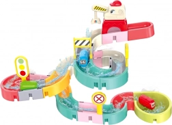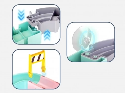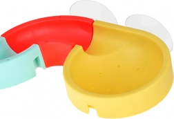 A hajlított vályú és a szűrővel ellátott lezárás mini zuhanyt hoz létre. A gyerekek figyelhetik a víz áramlását és a kapszulaautók mozgását a pályán.