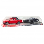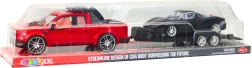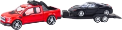 Ez a látványos készlet egy piros, frikciós meghajtású terepjárót, egy leválasztható utánfutót és egy elegáns fekete sportkocsit kombinál. A valósághű kidolgozás, a fényes felület és a részletgazdag elemek élethű hatást keltenek, és támogatják a kreatív játékszcenáriókat – a járműszállítástól a izgalmas versenyekig.