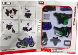 Fedezd fel az építés örömét a stílusos DIY motorkerékpár modellel 1:14 méretarányban. A fém és minőségi műanyag alkatrészek masszív és tartós szerkezetet biztosítanak, míg a feltűnő zöld–kék kombináció sportos megjelenést kölcsönöz a kész modellnek. Összeszerelés után a motor remek játékra és szobadísznek egyaránt.