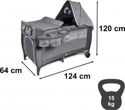 Ez a többfunkciós utazóágy a születéstől kb. 36 hónapos korig együtt nő gyermekével. A masszív X alakú váz és a két magassági szint biztonságot és kényelmet nyújt, míg a hálós panelek kiváló szellőzést és jó rálátást biztosítanak a babára. A tető szúnyoghálóval véd a rovarok ellen, a függő plüss játékok pedig lefoglalják a kicsit.