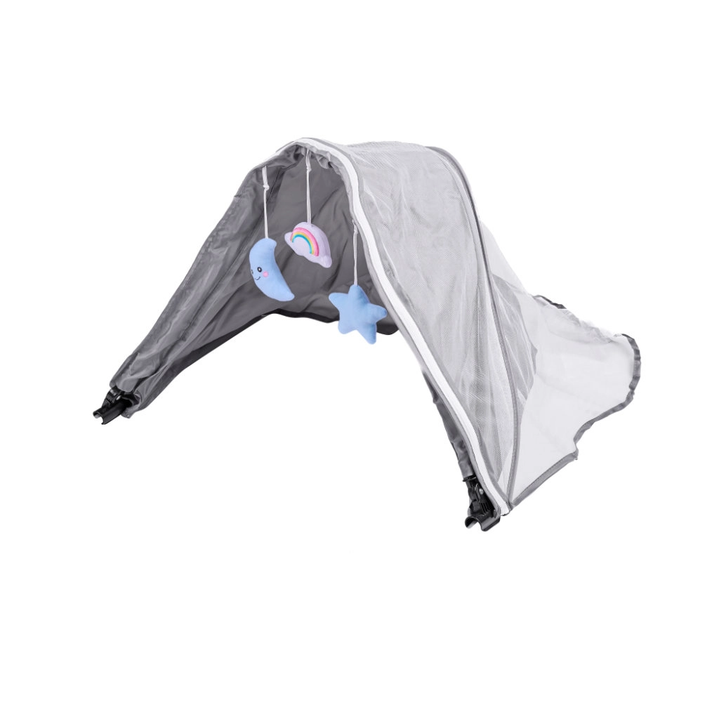 A könnyű háló megvédi a babát a rovaroktól, miközben szellőzik. A függő plüss játékok (hold, szivárvány, csillag) támogatják az érzékszervek fejlődését és szórakoztatják a kicsit.