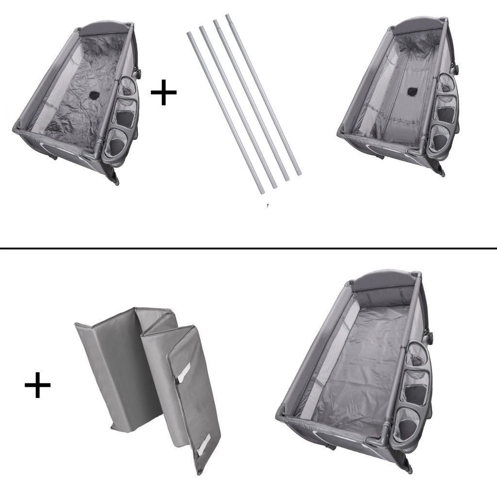 A szülők számára pelenkázó feltét és praktikus rendszerezők állnak rendelkezésre a pelenkák és apróságok számára, így minden mindig kéznél van. A gyors összecsukó mechanizmus, a rögzíthető kerekek és a hordtáska megkönnyítik a szállítást és a tárolást – ideális nyaraláshoz, nagyszülőkhöz vagy kisebb lakásokba.
