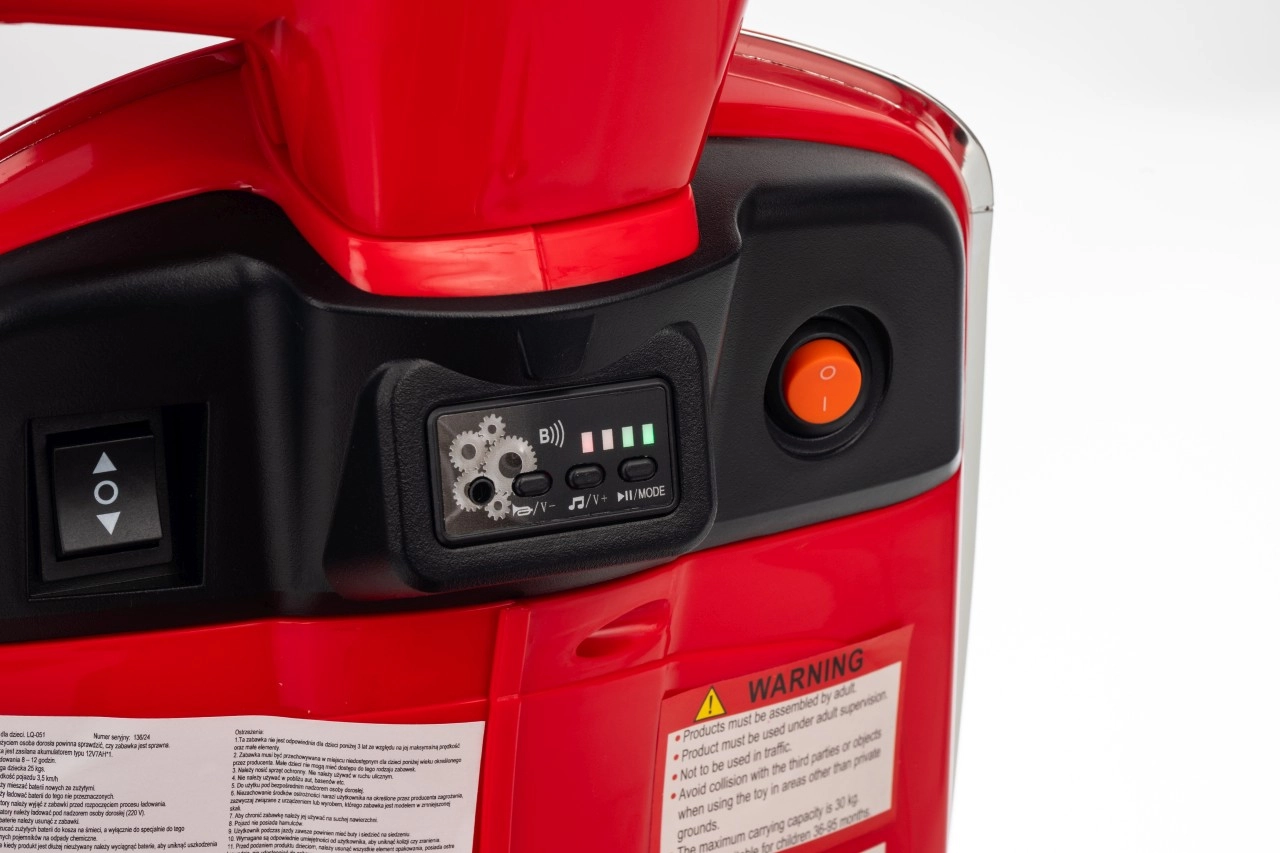 A kicsik szórakozásáról az integrált audiopanel gondoskodik – játssza le a kedvenc dalokat Bluetoothon, MP3-on vagy AUX-on keresztül. A kormányon hangeffektek és duda gombok találhatók, az ökobőr ülés pedig hosszabb utak során is kényelmet biztosít. Az akkumulátor töltöttségi jelzője segít tudni, mikor kell tölteni.