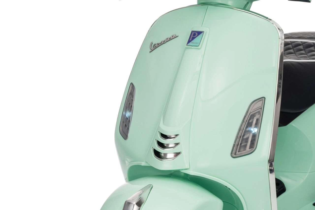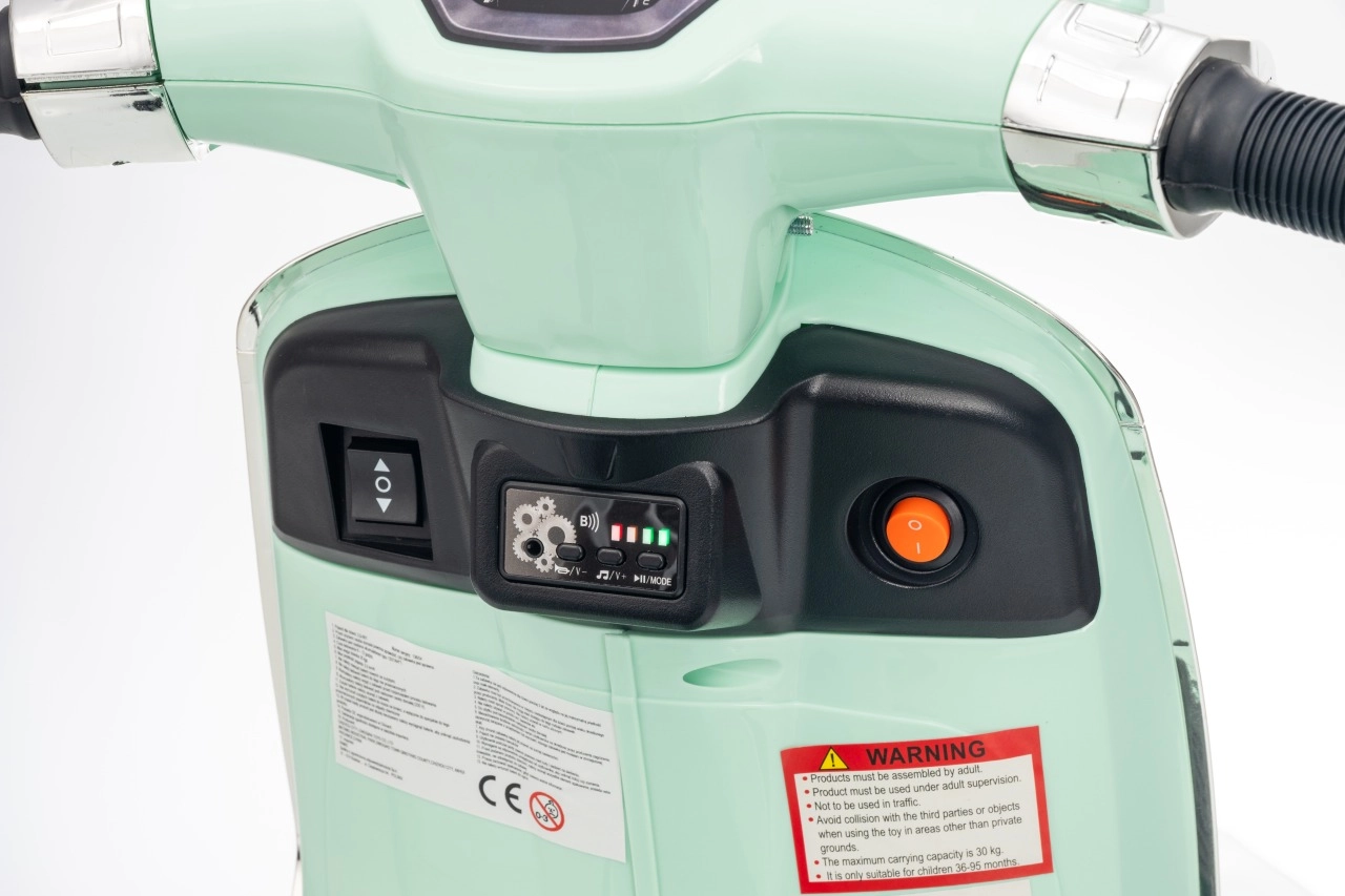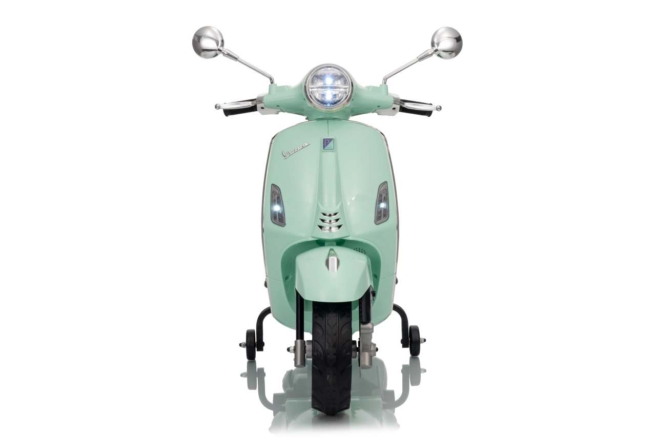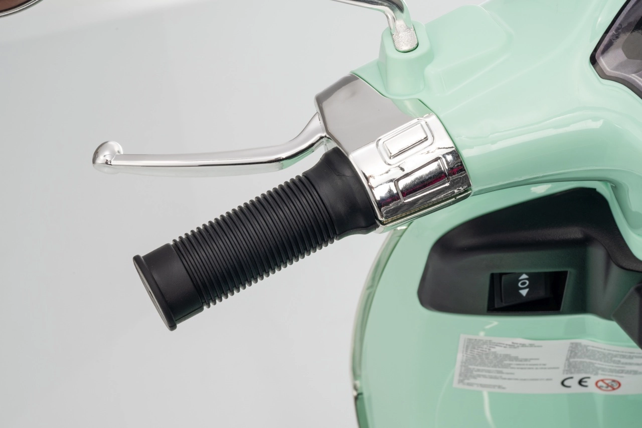 Stílusos gyerek elektromos roller, a VESPA Roma mentazöld színben, valósághű dizájnnal, két motorral 2×35 W, erős 12 V 7 Ah akkumulátorral és stabilizáló kerekekkel a biztonságos közlekedésért. A kényelmet a ökobőr ülés, csendes EVA kerekek és elöl-hátul LED lámpák biztosítják. Nem hiányzik a Bluetooth/MP3/AUX, kormányon elhelyezett hangok és duda, valamint a töltöttségjelző sem.