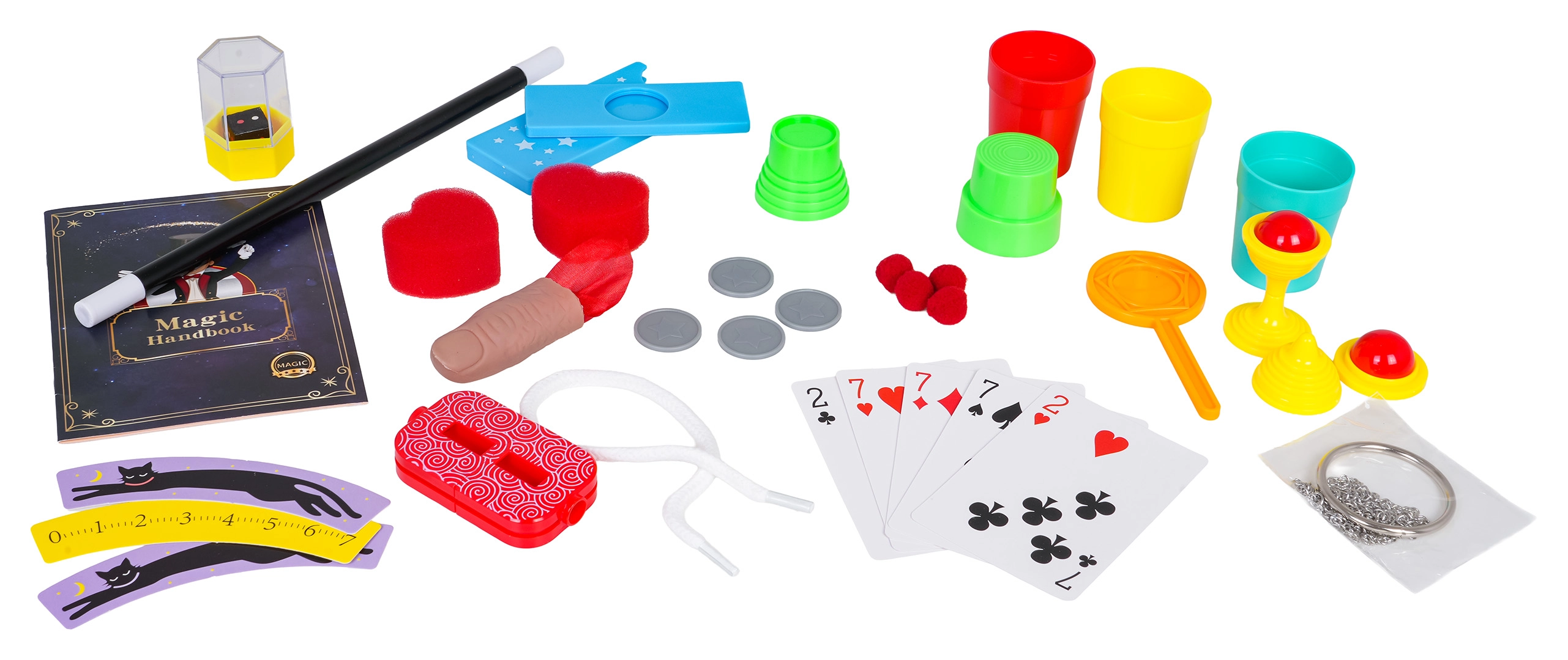 A csomagban változatos bűvészkellékeket találsz – a bűvészpálcától, poharaktól és érméktől kezdve egészen a speciális eszközökig, amelyek a közönség figyelmének irányítását segítik. Minden trükk világosan magyarázott és gyerekekhez igazított, hogy sikerélményt adjon és önbizalmat építsen.