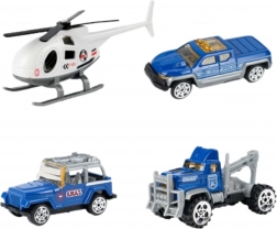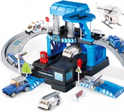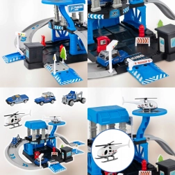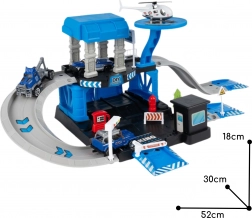 A csomag része 3 fém rendőrautó (véletlenszerű modellek) és egy rendőrségi helikopter, így a gyerekek egyedül és barátokkal is élvezhetik a játékot. A masszív felépítés tartós műanyagból és a élénk színek biztonságos, vonzó szórakozást garantálnak 3 éves kortól.