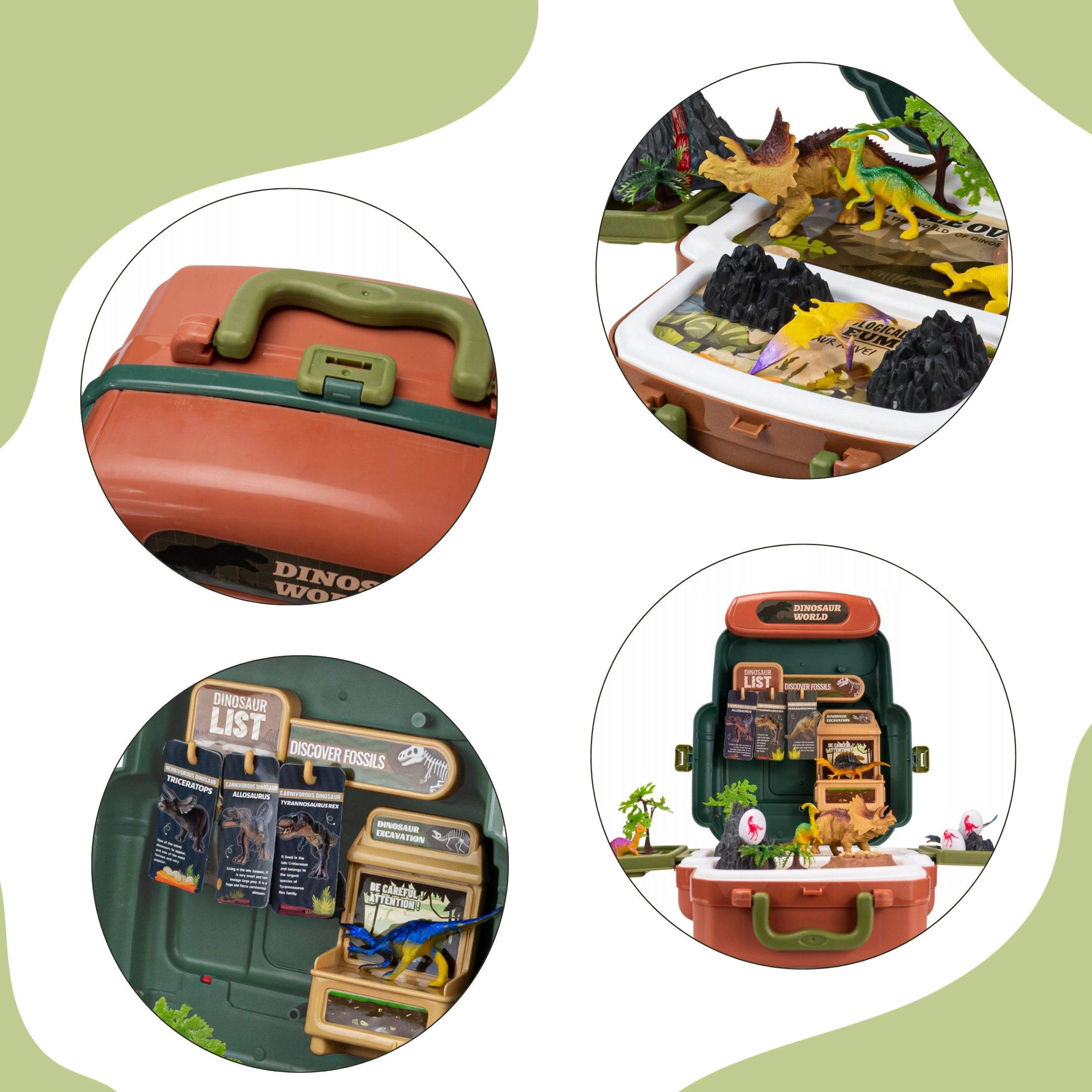A bőrönd kinyitva mini „Dinosaur World”-dé alakul rekeszekkel és jelenettel. A fogantyúnak köszönhetően könnyen szállítható, és mindent egyben tart.