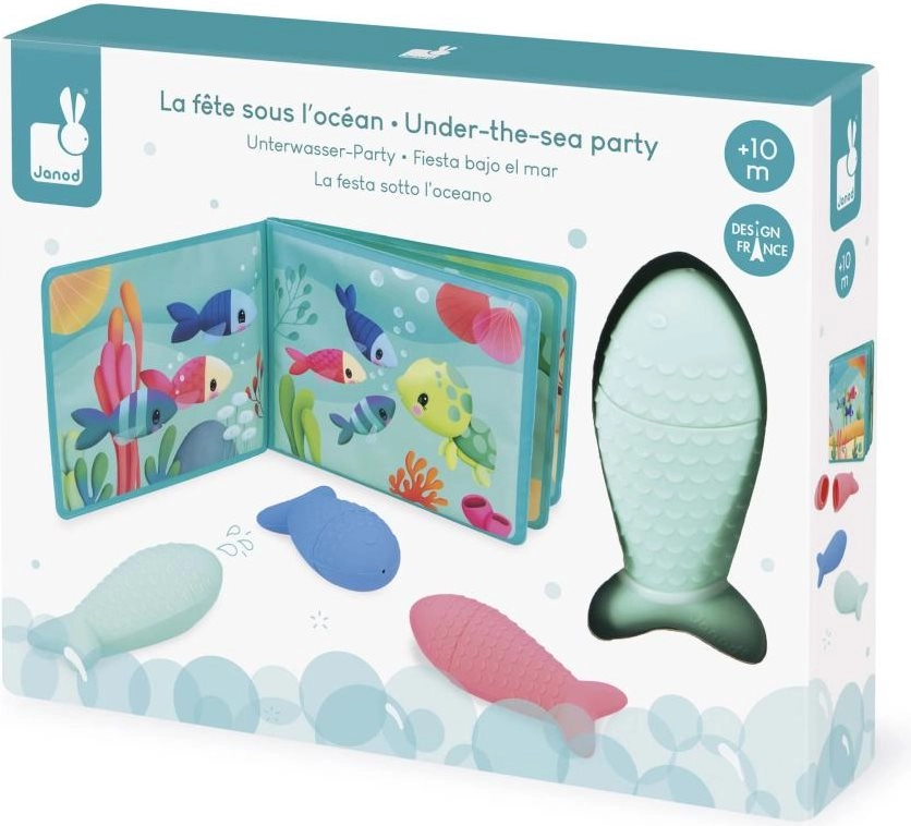 - 1× vízálló „Óceáni party” fürdőkönyv, 3× spriccelős játék halacska formában