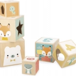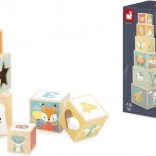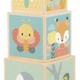 Sima felületű fa kockák kedves állatfigurákkal és lágy színekkel – játékra hívnak és bírják a mindennapos használatot.
